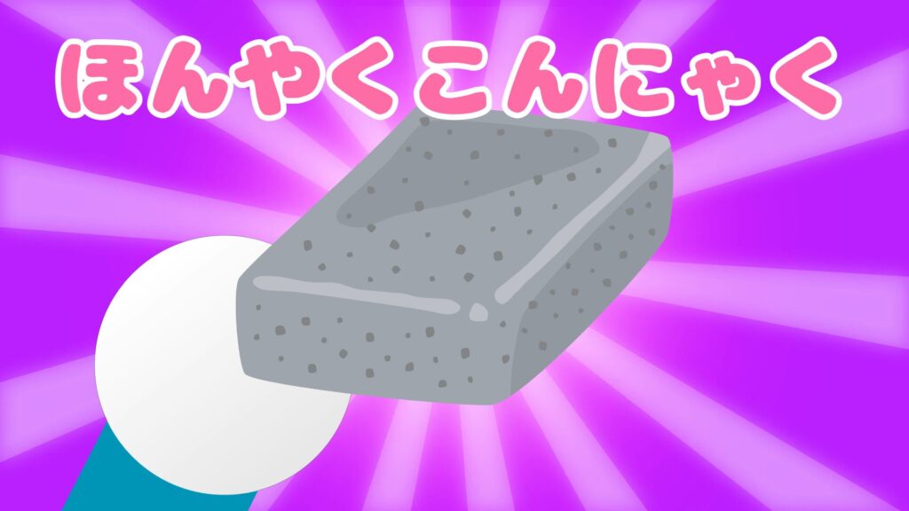 会話アニメでジョバはこんにゃくがわからないけど、翻訳こんにゃくを思い出してこんにゃくが分かるという内容にしました。翻訳こんにゃくはドラえもんの道具で、食べるとどんな言語でも話せるようになる道具ですね。翻訳こんにゃくを持っている手をドラえもんっぽくしてみたのですが、気づいていただけましたでしょうか。ぜひ見てみてください。